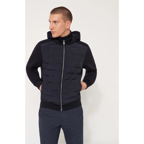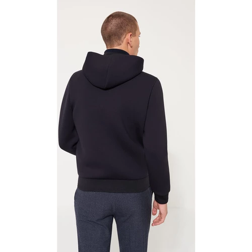 Sweat. Coupe Slim : coupe ajustée et près du corps. Confectionné en poly viscose. Tissage maille serré. Devant matelassé Col montant avec capuche Fermeture à glissière. Poches devant inserées. Bas de manche bord côtes double. Bas de corps bord côtes double. Le mannequin mesure 1m84 et porte du M.