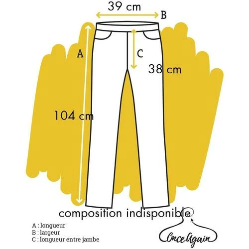 étiquette du produit : FR 38 Longueur : 104 / Largeur :39 / Longueur taille / entrejambe : 38Matière :composition indisponible