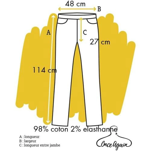 étiquette du produit : 46 Longueur : 114 / Largeur :48 / Longueur taille / entrejambe : 27Matière :98% coton 2% elasthanne