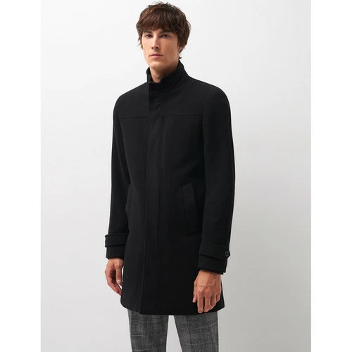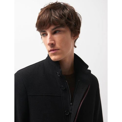 Pardessus en drap de laine coupe mi-longue riche en laine. Col montant avec patte boutonnĂ©e. IntĂ©rieur col en bord de cote. Fermeture avant Ă fermeture Ă©clair sous patte Ă boutonnage. 2 poches en biais passepoilĂ©es de chaque cĂ´tĂ©. Entièrement doublĂ©. Poignets en bord de cote. Patte boutonnĂ©e au niveau des poignets. Fente d’aisance Ă l’arrière. 2 poches intĂ©rieures boutonnĂ©es. Le mannequin mesure 1m84 et porte du M.